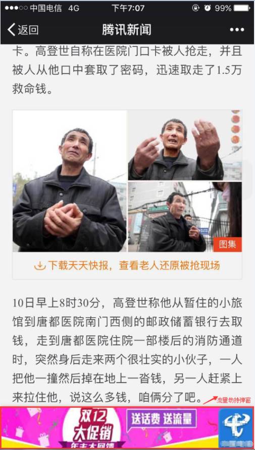 如果你用微信【APP】(微信里面打开网页都会遇到有劫持,打包APP里面也会遇到劫持)浏览某个网页时(比如微信公众号文章或者外部网页),在打开的页面上发现非当前页面提供的广告弹窗或浮层,这很可能表示你的流量被劫持了。
